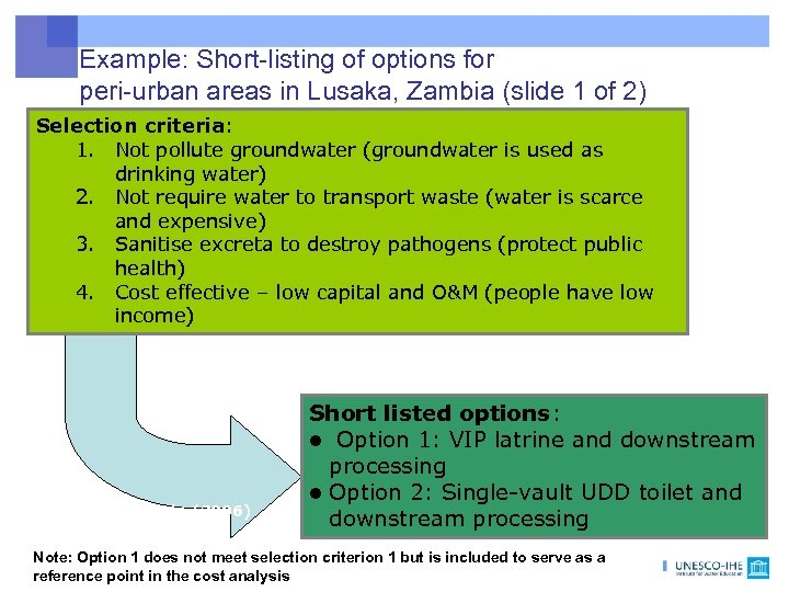 Example: Short-listing of options for peri-urban areas in Lusaka, Zambia (slide 1 of 2) Selection criteria: 1. Not pollute groundwater (groundwater is used as drinking water) 2. Not require water to transport waste (water is scarce and expensive) 3. Sanitise excreta to destroy pathogens (protect public health) 4. Cost effective – low capital and O&M (people have low income) Source: Mayumbelo (2006) Short listed options: l Option 1: VIP latrine and downstream processing l Option 2: Single-vault UDD toilet and downstream processing Note: Option 1 does not meet selection criterion 1 but is included to serve as a reference point in the cost analysis