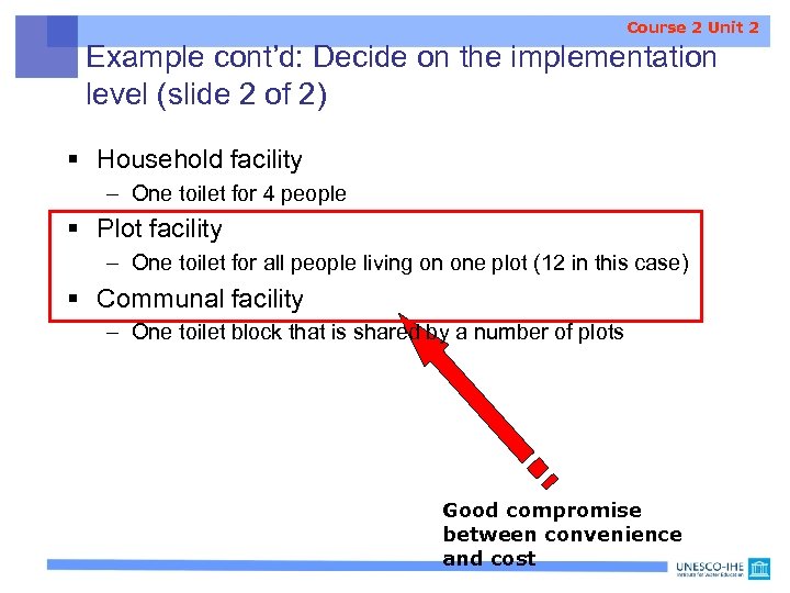 Course 2 Unit 2 Example cont’d: Decide on the implementation level (slide 2 of 2) § Household facility – One toilet for 4 people § Plot facility – One toilet for all people living on one plot (12 in this case) § Communal facility – One toilet block that is shared by a number of plots Good compromise between convenience and cost
