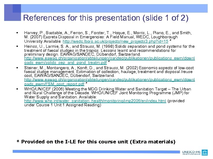 References for this presentation (slide 1 of 2) § § Harvey, P. , Bastable, A. , Ferron, S. , Forster, T. , Hoque, E. , Morris, L. , Piano, E. , and Smith, M. (2007) Excreta Disposal in Emergencies: A Field Manual, WEDC, Loughborough University Available: http: //wedc. lboro. ac. uk/projects/new_projects 3. php? id=15 * Heinss, U. , Larmie, S. A. , and Strauss, M. (1998) Solids separation and pond systems for the treatment of faecal sludges in the tropics. Lessons learnt and recommendations for preliminary design. EAWAG/SANDEC, Dübendorf, Switzerland. http: //www. eawag. ch/organisation/abteilungen/sandec/publikationen/publications_ewm/downl oads_ewm/solids_sep_and_pond_treatm. pdf * Steiner, M. , Montangero, A. , Koné, D. , and Strauss, M. (2002) Economic aspects of low-cost faecal sludge management. Estimation of collection, haulage, treatment and disposal /reuse cost, EAWAG/SANDEC, Dübendorf, Switzerland. http: //www. eawag. ch/organisation/abteilungen/sandec/publikationen/publications_ewm/downl oads_ewm/FSM_cost_report. pdf * WHO/UNICEF (2006) Meeting the MDG Drinking Water and Sanitation Target – The Urban and Rural Challenge of the Decade. WHO/UNICEF Joint Monitoring Programme (JMP) for Water Supply and Sanitation. Available: http: //www. who. int/water_sanitation_health/monitoring/jmp 2006/en/index. html (provided under Course 1 Unit 1 Assigned Reading) * Provided on the I-LE for this course unit (Extra materials)