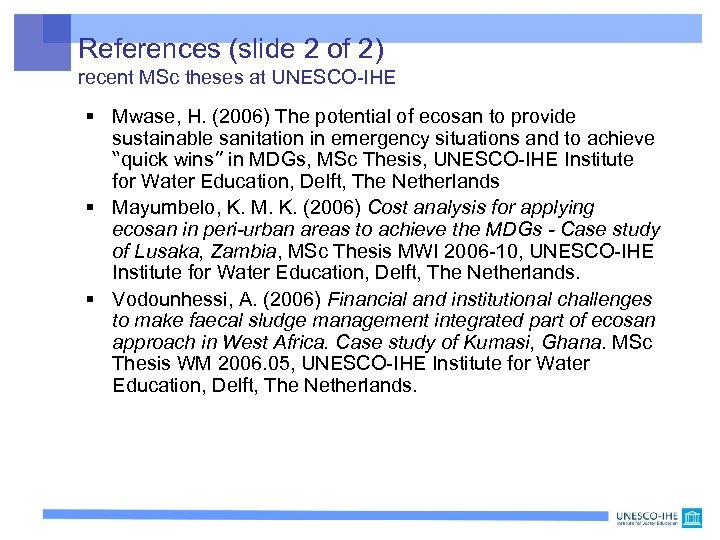 References (slide 2 of 2) recent MSc theses at UNESCO-IHE § Mwase, H. (2006) The potential of ecosan to provide sustainable sanitation in emergency situations and to achieve “quick wins” in MDGs, MSc Thesis, UNESCO-IHE Institute for Water Education, Delft, The Netherlands § Mayumbelo, K. M. K. (2006) Cost analysis for applying ecosan in peri-urban areas to achieve the MDGs - Case study of Lusaka, Zambia, MSc Thesis MWI 2006 -10, UNESCO-IHE Institute for Water Education, Delft, The Netherlands. § Vodounhessi, A. (2006) Financial and institutional challenges to make faecal sludge management integrated part of ecosan approach in West Africa. Case study of Kumasi, Ghana. MSc Thesis WM 2006. 05, UNESCO-IHE Institute for Water Education, Delft, The Netherlands. The first two are also available from the GTZ literature database: http: //www. gtz. de/en/themen/umwelt-infrastruktur/wasser/9835. htm