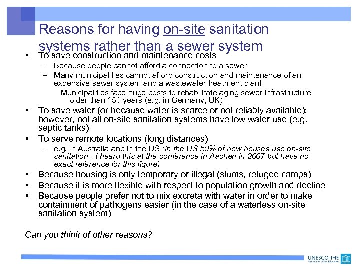 § Reasons for having on-site sanitation systems rather than a sewer system To save construction and maintenance costs – Because people cannot afford a connection to a sewer – Many municipalities cannot afford construction and maintenance of an expensive sewer system and a wastewater treatment plant Municipalities face huge costs to rehabilitate aging sewer infrastructure older than 150 years (e. g. in Germany, UK) § § To save water (or because water is scarce or not reliably available); however, not all on-site sanitation systems have low water use (e. g. septic tanks) To serve remote locations (long distances) – e. g. in Australia and in the US (in the US 50% of new houses use on-site sanitation - I heard this at the conference in Aachen in 2007 but have no exact reference for this figure) § § § Because housing is only temporary or illegal (slums, refugee camps) Because it is more flexible with respect to population growth and decline Because people prefer not to mix excreta with water in order to make containment of pathogens easier (in the case of a waterless on-site sanitation system) Can you think of other reasons?