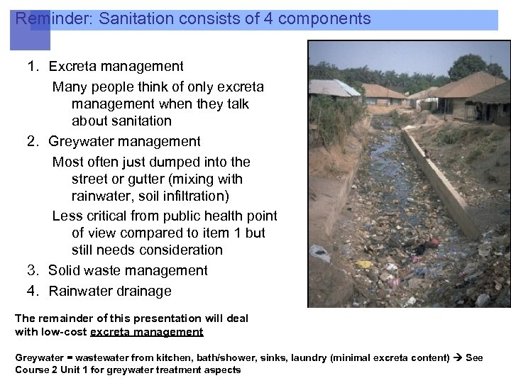 Reminder: Sanitation consists of 4 components 1. Excreta management Many people think of only excreta management when they talk about sanitation 2. Greywater management Most often just dumped into the street or gutter (mixing with rainwater, soil infiltration) Less critical from public health point of view compared to item 1 but still needs consideration 3. Solid waste management 4. Rainwater drainage The remainder of this presentation will deal with low-cost excreta management Greywater = wastewater from kitchen, bath/shower, sinks, laundry (minimal excreta content) See Course 2 Unit 1 for greywater treatment aspects