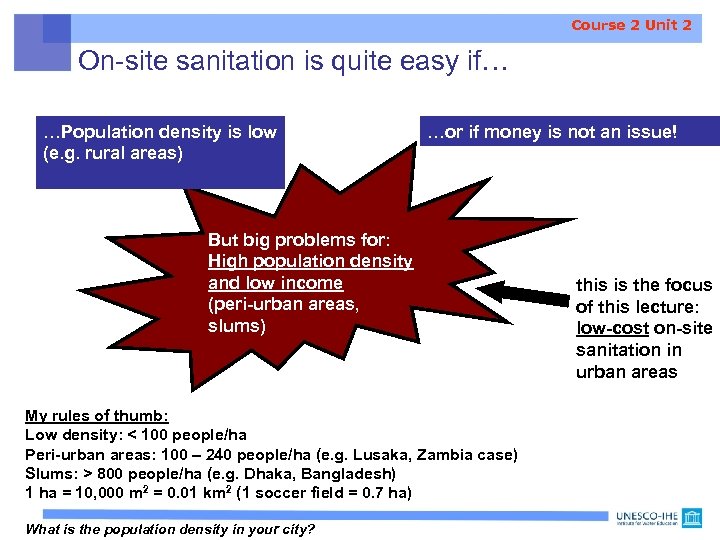 Course 2 Unit 2 On-site sanitation is quite easy if… …Population density is low (e. g. rural areas) …or if money is not an issue! But big problems for: High population density and low income (peri-urban areas, slums) My rules of thumb: Low density: < 100 people/ha Peri-urban areas: 100 – 240 people/ha (e. g. Lusaka, Zambia case) Slums: > 800 people/ha (e. g. Dhaka, Bangladesh) 1 ha = 10, 000 m 2 = 0. 01 km 2 (1 soccer field = 0. 7 ha) What is the population density in your city? this is the focus of this lecture: low-cost on-site sanitation in urban areas