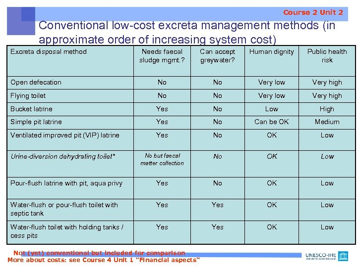 Course 2 Unit 2 Conventional low-cost excreta management methods (in approximate order of increasing system cost) Excreta disposal method Needs faecal sludge mgmt. ? Can accept greywater? Human dignity Public health risk Open defecation No No Very low Very high Flying toilet No No Very low Very high Bucket latrine Yes No Low High Simple pit latrine Yes No Can be OK Medium Ventilated improved pit (VIP) latrine Yes No OK Low No but faecal matter collection No OK Low Pour-flush latrine with pit, aqua privy Yes No OK Low Water-flush or pour-flush toilet with septic tank Yes OK Low Water-flush toilet with holding tanks / cess pits Yes OK Low Urine-diversion dehydrating toilet* * Not (yet) conventional but included for comparison More about costs: see Course 4 Unit 1 “Financial aspects”
