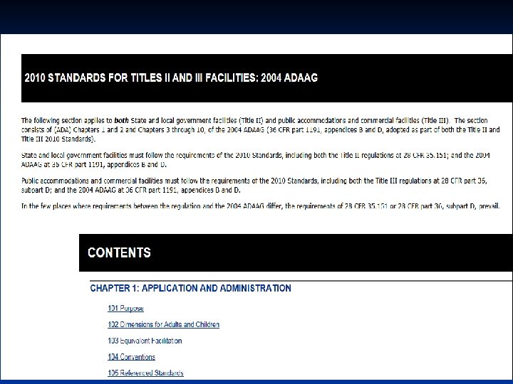 Overview of changes in the 2010 ADA Standards Safe Harbor Title II & III New term “safe harbor”: Existing elements covered under the 1991 ADA Standards that comply with those requirements are “safe” from further changes. Section 35. 150(b)(2)(i). Exception: new facilities not previously “codified” 51