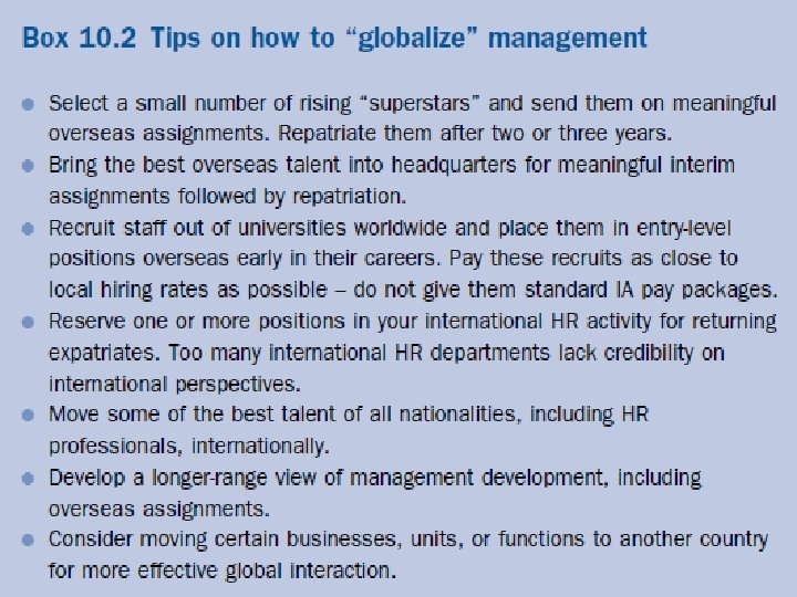 International Experience & Promotions Ø In most MNCs international experience is indispensable for promotion. In Colgate-Palmolive, Cargill, Exxon. Mobil, 3 M, and IBM it is important to have international assignments early in a person’s career. Astra Zeneca encourages by all means employees to go international. Ø Michael Angus, CEO of Unilever said: “Most people who rise toward the top of our business will have worked in at least two countries, probably three. They will probably speak another language and they most certainly will have worked in different product areas. ” Ø Few MNCs today limit their search for senior-level executive talent to their home countries: Bank of America former CFO Al de Molina began his ascent to the top in his native Cuba.