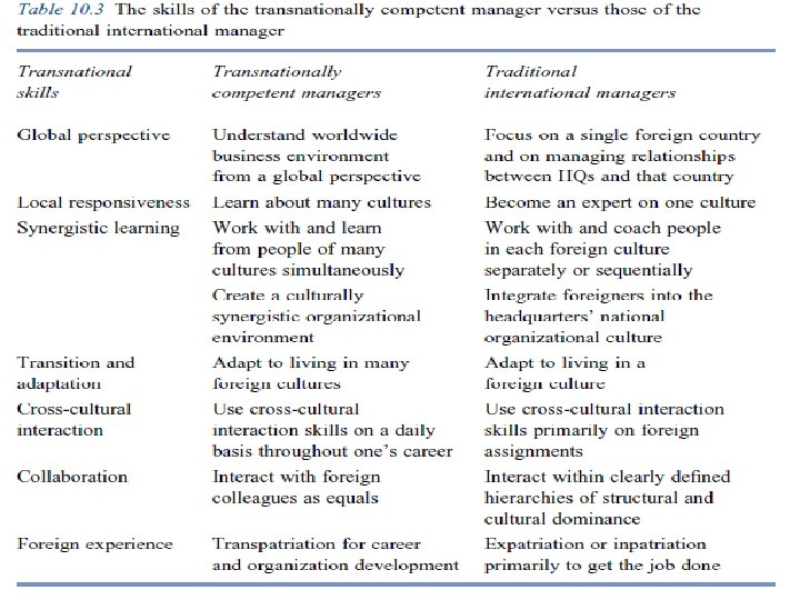 The Global Mindset (cont) Ø The most essential experience towards acquiring a global mindset is to live and work in more than one radically different cultures. Cultural shock is an unpleasant necessity. Ø Proximity to a foreign culture through conventional work does not suffice. To develop cultural competency, one must take deliberate steps to learn about another country’s or culture’s practices and values. One must make a concerted effort to learn about the deep values that motivate people and provide the context for their actions* Ø John Pepper, former CEO and then Chairman of the board of directors of Proctor & Gamble stated: (reported by Briscoe & Schuler) “There a few things that totally change your life, and taking m first international assignment in Italy was just that kind of experience. Of all the career changes that I have had, the international assignment was the most important and developmental. It changed me as a person. ”