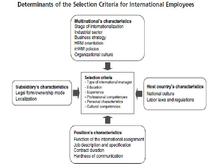 Selection Criteria for International Assignments General Criteria . n Adaptability n Education n Decision skills n Knowledge of local language n Self-reliance n Cultural sensitivity n Physical & emotional health n Motivation n Age n Support of spouse & children n Experience n Coaching capabilities n Resourcefulness n Negotiating skills