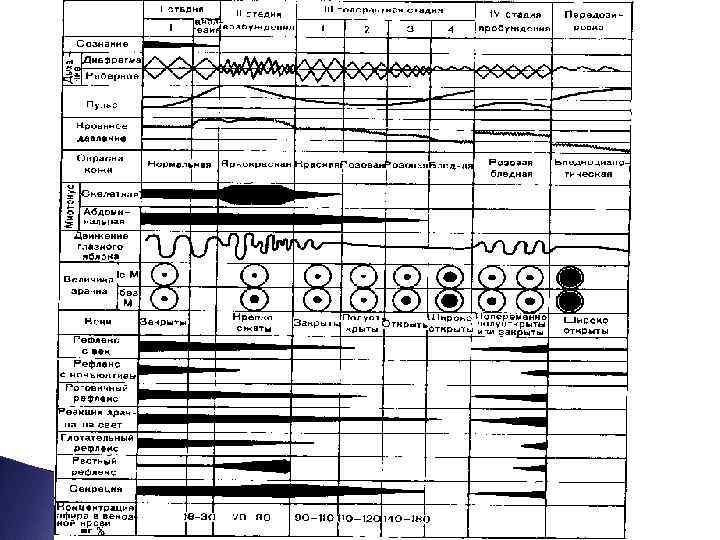 СТАДИИ ОБЩЕЙ АНЕСТЕЗИИ (Гведел, 1920 г. Клиническое течение анестезии сложное и многогранное, требует постоянного и четкого наблюдения за состоянием больного. Клиническая картина анестезии имеет как определенные отличия, так и общие черты стадии: I стадия - анальгезии (привыкания, усыпления); II стадия - возбуждения (расторможенности); III стадия - хирургическая; 1, 2, 3, 4 IV стадия - пробуждения (передозировки).