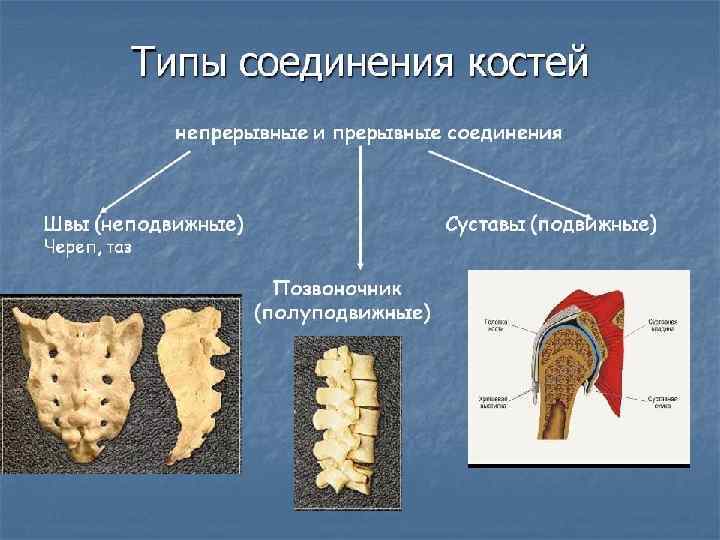 Непрерывные соединения костей имеют большую упругость, прочность; движения в таких соединениях ограничены. В зависимости от характера связующей ткани между костями выделяют три вида непрерывных соединений: 1)синдесмозы (syndesmosis) - фиброзные соединения; 2)синхондрозы (synchondrosis) - хрящевые соединения; 3) синостозы (synostosis) - костные соединения.