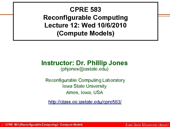 CPRE 583 Reconfigurable Computing Lecture 12: Wed 10/6/2010 (Compute Models) Instructor: Dr. Phillip Jones (phjones@iastate. edu) Reconfigurable Computing Laboratory Iowa State University Ames, Iowa, USA http: //class. ee. iastate. edu/cpre 583/ 1 - CPRE 583 (Reconfigurable Computing): Compute Models Iowa State University (Ames)