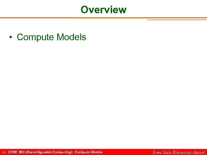 Overview • Compute Models 14 - CPRE 583 (Reconfigurable Computing): Compute Models Iowa State University (Ames)
