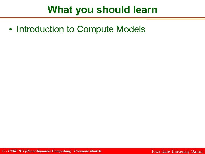 What you should learn • Introduction to Compute Models 15 - CPRE 583 (Reconfigurable Computing): Compute Models Iowa State University (Ames)