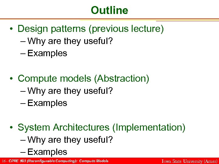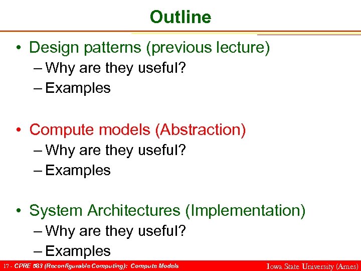 Outline • Design patterns (previous lecture) – Why are they useful? – Examples • Compute models (Abstraction) – Why are they useful? – Examples • System Architectures (Implementation) – Why are they useful? – Examples 16 - CPRE 583 (Reconfigurable Computing): Compute Models Iowa State University (Ames)