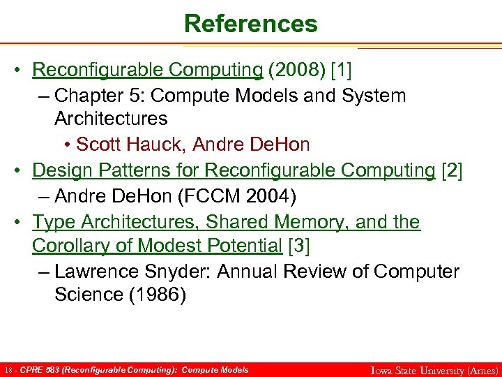 Outline • Design patterns (previous lecture) – Why are they useful? – Examples • Compute models (Abstraction) – Why are they useful? – Examples • System Architectures (Implementation) – Why are they useful? – Examples 17 - CPRE 583 (Reconfigurable Computing): Compute Models Iowa State University (Ames)