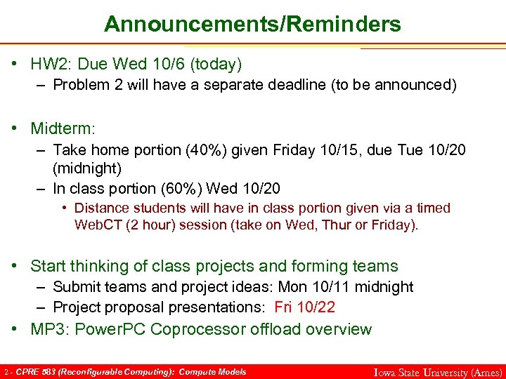 Announcements/Reminders • HW 2: Due Wed 10/6 (today) – Problem 2 will have a separate deadline (to be announced) • Midterm: – Take home portion (40%) given Friday 10/15, due Tue 10/20 (midnight) – In class portion (60%) Wed 10/20 • Distance students will have in class portion given via a timed Web. CT (2 hour) session (take on Wed, Thur or Friday). • Start thinking of class projects and forming teams – Submit teams and project ideas: Mon 10/11 midnight – Project proposal presentations: Fri 10/22 • MP 3: Power. PC Coprocessor offload overview 2 - CPRE 583 (Reconfigurable Computing): Compute Models Iowa State University (Ames)