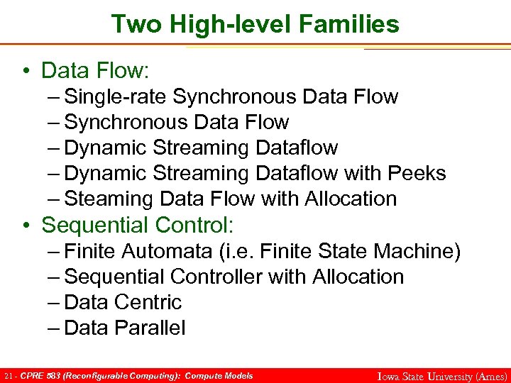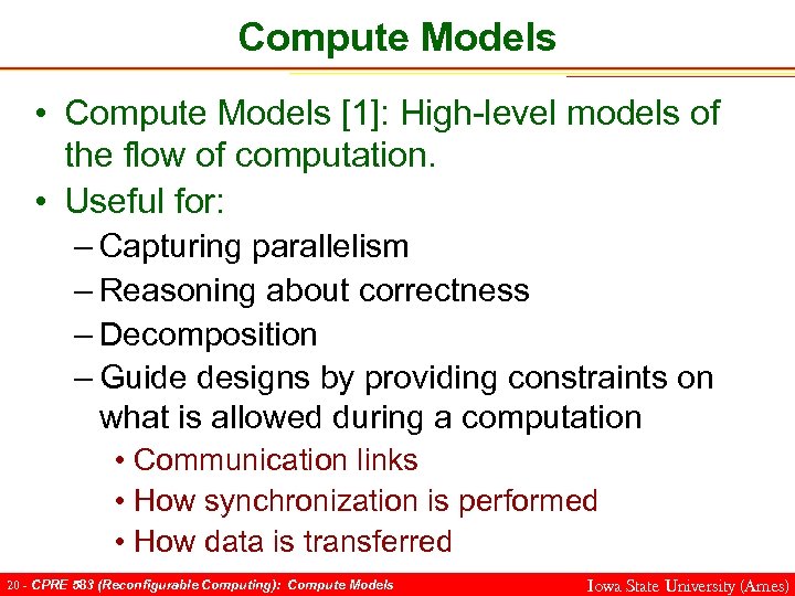 Compute Models • Compute Models [1]: High-level models of the flow of computation. • Useful for: – Capturing parallelism – Reasoning about correctness – Decomposition – Guide designs by providing constraints on what is allowed during a computation • Communication links • How synchronization is performed • How data is transferred 20 - CPRE 583 (Reconfigurable Computing): Compute Models Iowa State University (Ames)