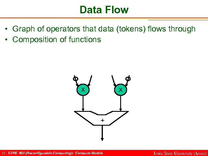 Data Flow • Graph of operators that data (tokens) flows through • Composition of functions X X + 23 - CPRE 583 (Reconfigurable Computing): Compute Models Iowa State University (Ames)