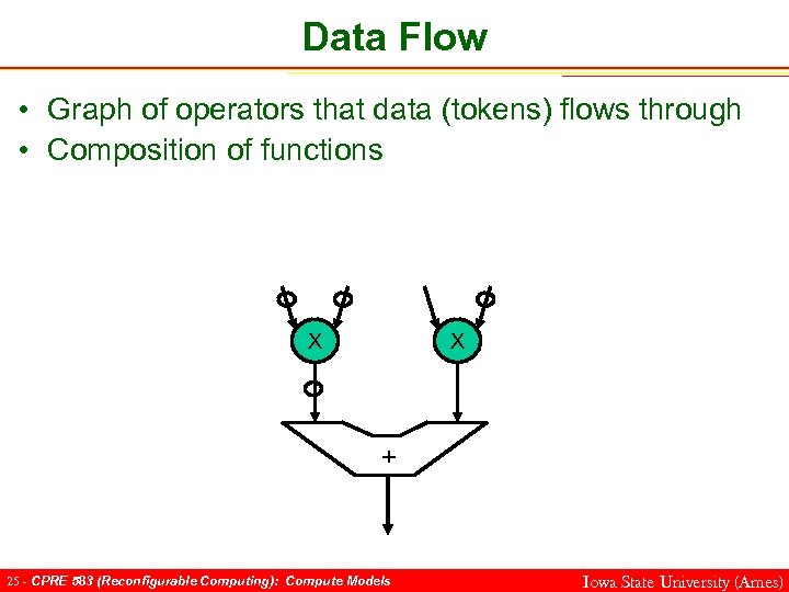 Data Flow • Graph of operators that data (tokens) flows through • Composition of functions X X + 25 - CPRE 583 (Reconfigurable Computing): Compute Models Iowa State University (Ames)