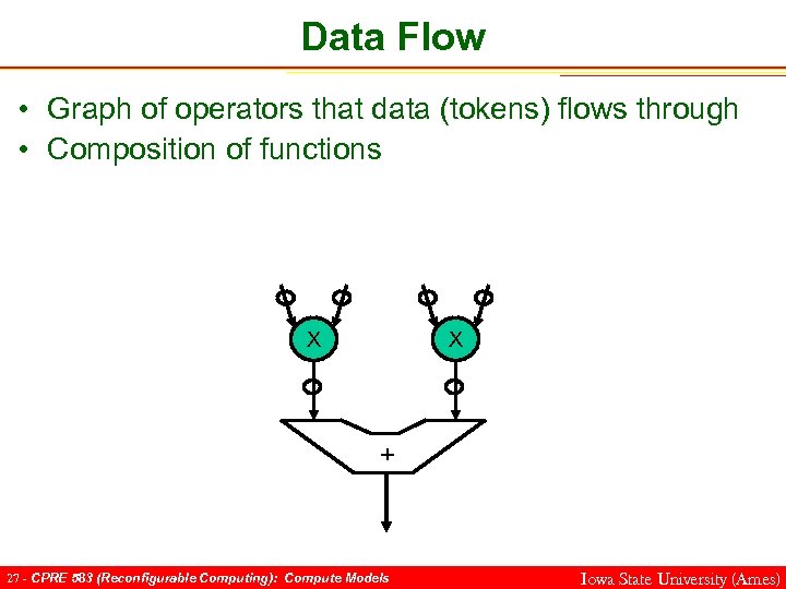 Data Flow • Graph of operators that data (tokens) flows through • Composition of functions X X + 26 - CPRE 583 (Reconfigurable Computing): Compute Models Iowa State University (Ames)