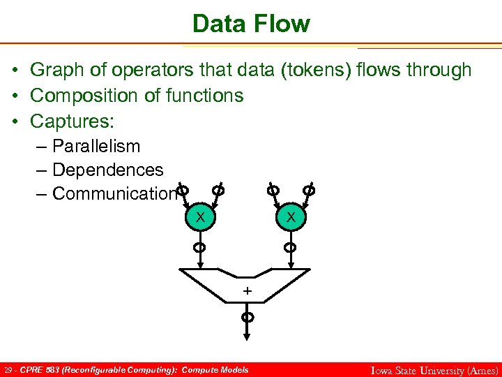 Data Flow • Graph of operators that data (tokens) flows through • Composition of functions X X + 28 - CPRE 583 (Reconfigurable Computing): Compute Models Iowa State University (Ames)