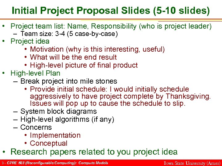 Initial Project Proposal Slides (5 -10 slides) • Project team list: Name, Responsibility (who is project leader) – Team size: 3 -4 (5 case-by-case) • Project idea • Motivation (why is this interesting, useful) • What will be the end result • High-level picture of final product • High-level Plan – Break project into mile stones • Provide initial schedule: I would initially schedule aggressively to have project complete by Thanksgiving. Issues will pop up to cause the schedule to slip. – System block diagrams – High-level algorithms (if any) – Concerns • Implementation • Conceptual • Research papers related to you project idea 3 - CPRE 583 (Reconfigurable Computing): Compute Models Iowa State University (Ames)