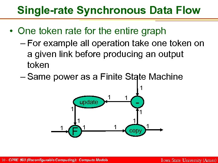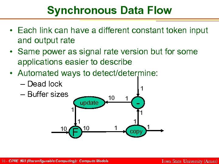 Single-rate Synchronous Data Flow • One token rate for the entire graph – For example all operation take one token on a given link before producing an output token – Same power as a Finite State Machine 1 update 1 1 1 F 1 30 - CPRE 583 (Reconfigurable Computing): Compute Models 1 1 copy 1 Iowa State University (Ames)