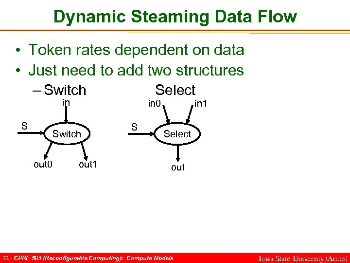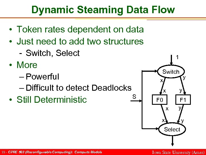 Dynamic Steaming Data Flow • Token rates dependent on data • Just need to add two structures – Switch Select in S Switch out 0 out 1 in 0 S in 1 Select out 32 - CPRE 583 (Reconfigurable Computing): Compute Models Iowa State University (Ames)