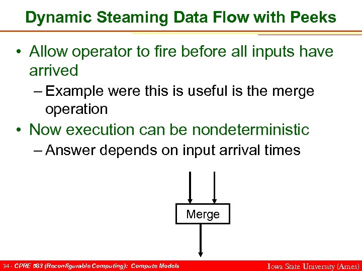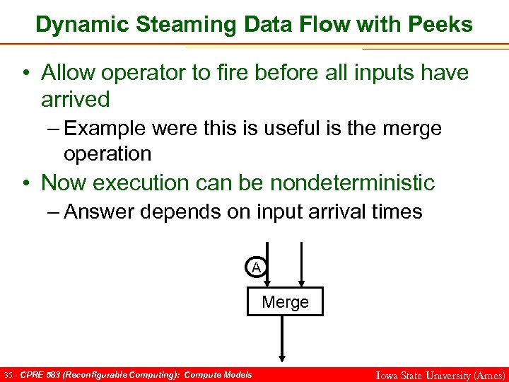 Dynamic Steaming Data Flow with Peeks • Allow operator to fire before all inputs have arrived – Example were this is useful is the merge operation • Now execution can be nondeterministic – Answer depends on input arrival times Merge 34 - CPRE 583 (Reconfigurable Computing): Compute Models Iowa State University (Ames)