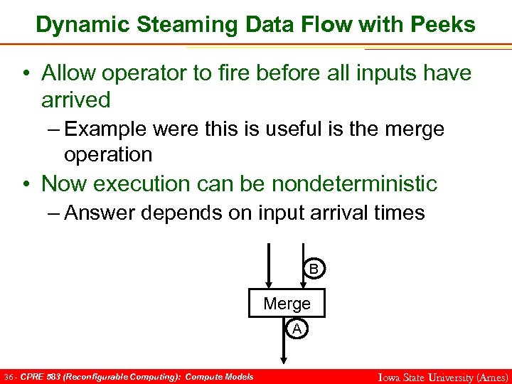 Dynamic Steaming Data Flow with Peeks • Allow operator to fire before all inputs have arrived – Example were this is useful is the merge operation • Now execution can be nondeterministic – Answer depends on input arrival times A Merge 35 - CPRE 583 (Reconfigurable Computing): Compute Models Iowa State University (Ames)