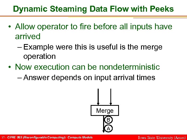 Dynamic Steaming Data Flow with Peeks • Allow operator to fire before all inputs have arrived – Example were this is useful is the merge operation • Now execution can be nondeterministic – Answer depends on input arrival times B Merge A 36 - CPRE 583 (Reconfigurable Computing): Compute Models Iowa State University (Ames)