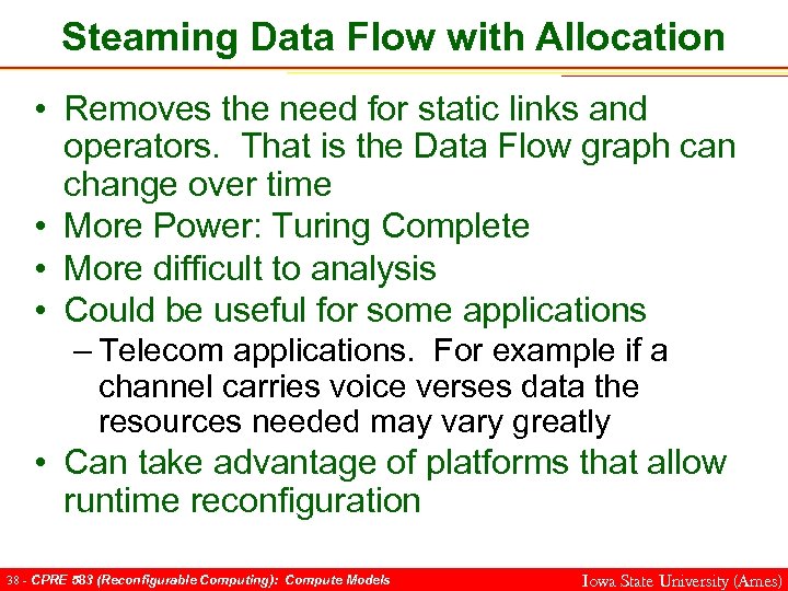 Steaming Data Flow with Allocation • Removes the need for static links and operators. That is the Data Flow graph can change over time • More Power: Turing Complete • More difficult to analysis • Could be useful for some applications – Telecom applications. For example if a channel carries voice verses data the resources needed may vary greatly • Can take advantage of platforms that allow runtime reconfiguration 38 - CPRE 583 (Reconfigurable Computing): Compute Models Iowa State University (Ames)