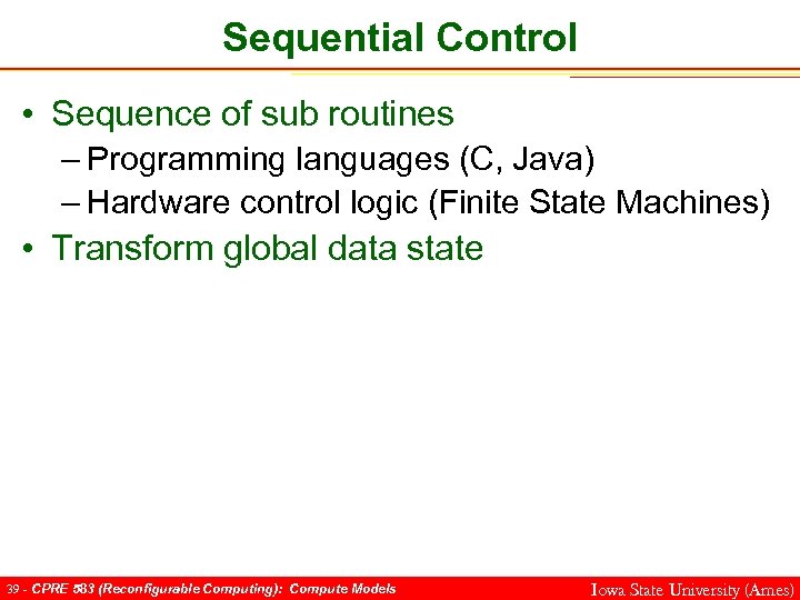 Sequential Control • Sequence of sub routines – Programming languages (C, Java) – Hardware control logic (Finite State Machines) • Transform global data state 39 - CPRE 583 (Reconfigurable Computing): Compute Models Iowa State University (Ames)