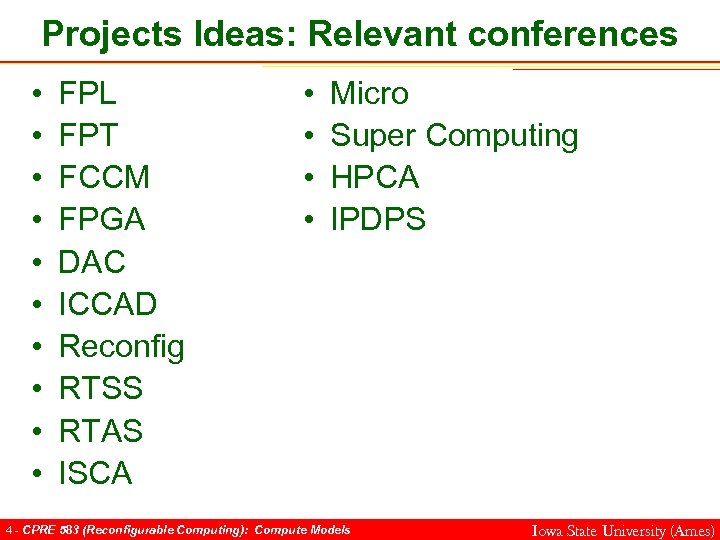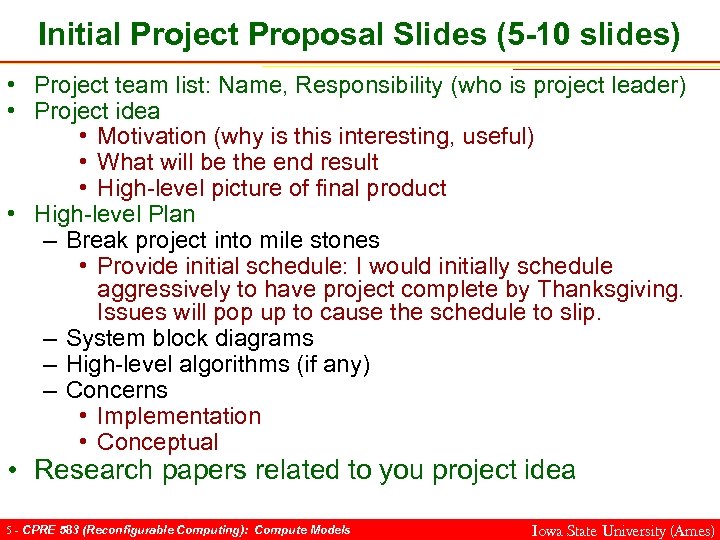 Projects Ideas: Relevant conferences • • • FPL FPT FCCM FPGA DAC ICCAD Reconfig RTSS RTAS ISCA • • Micro Super Computing HPCA IPDPS 4 - CPRE 583 (Reconfigurable Computing): Compute Models Iowa State University (Ames)
