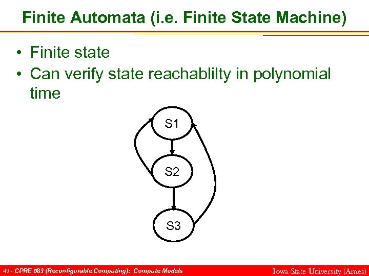 Finite Automata (i. e. Finite State Machine) • Finite state • Can verify state reachablilty in polynomial time S 1 S 2 S 3 40 - CPRE 583 (Reconfigurable Computing): Compute Models Iowa State University (Ames)