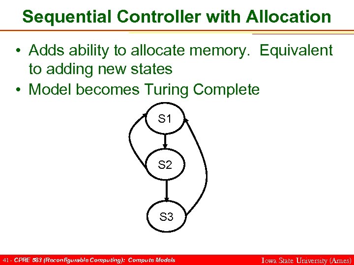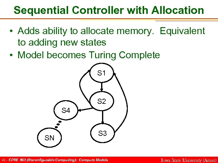 Sequential Controller with Allocation • Adds ability to allocate memory. Equivalent to adding new states • Model becomes Turing Complete S 1 S 2 S 3 41 - CPRE 583 (Reconfigurable Computing): Compute Models Iowa State University (Ames)