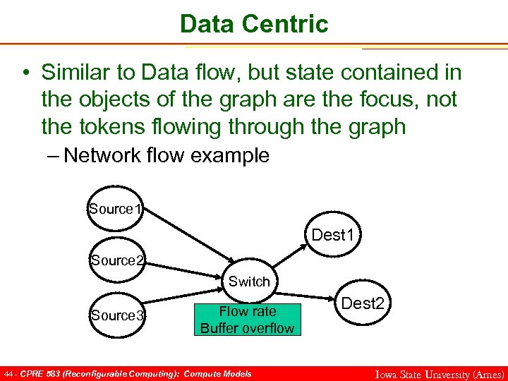 Data Centric • Similar to Data flow, but state contained in the objects of the graph are the focus, not the tokens flowing through the graph – Network flow example Source 1 Dest 1 Source 2 Switch Source 3 Flow rate Buffer overflow 44 - CPRE 583 (Reconfigurable Computing): Compute Models Dest 2 Iowa State University (Ames)