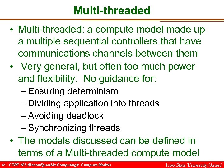 Multi-threaded • Multi-threaded: a compute model made up a multiple sequential controllers that have communications channels between them • Very general, but often too much power and flexibility. No guidance for: – Ensuring determinism – Dividing application into threads – Avoiding deadlock – Synchronizing threads • The models discussed can be defined in terms of a Multi-threaded compute model 45 - CPRE 583 (Reconfigurable Computing): Compute Models Iowa State University (Ames)