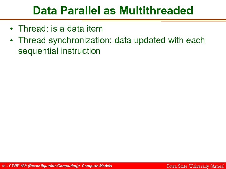 Data Parallel as Multithreaded • Thread: is a data item • Thread synchronization: data updated with each sequential instruction 48 - CPRE 583 (Reconfigurable Computing): Compute Models Iowa State University (Ames)