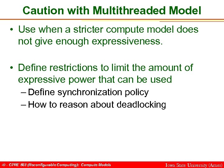 Caution with Multithreaded Model • Use when a stricter compute model does not give enough expressiveness. • Define restrictions to limit the amount of expressive power that can be used – Define synchronization policy – How to reason about deadlocking 49 - CPRE 583 (Reconfigurable Computing): Compute Models Iowa State University (Ames)
