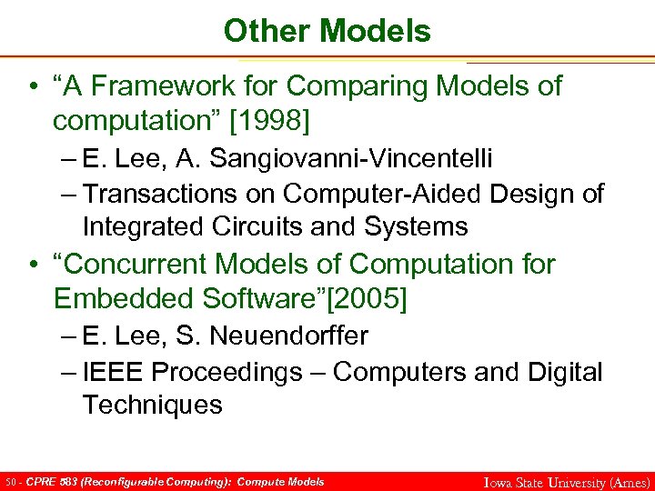 Other Models • “A Framework for Comparing Models of computation” [1998] – E. Lee, A. Sangiovanni-Vincentelli – Transactions on Computer-Aided Design of Integrated Circuits and Systems • “Concurrent Models of Computation for Embedded Software”[2005] – E. Lee, S. Neuendorffer – IEEE Proceedings – Computers and Digital Techniques 50 - CPRE 583 (Reconfigurable Computing): Compute Models Iowa State University (Ames)