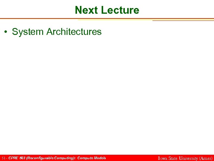 Next Lecture • System Architectures 51 - CPRE 583 (Reconfigurable Computing): Compute Models Iowa State University (Ames)