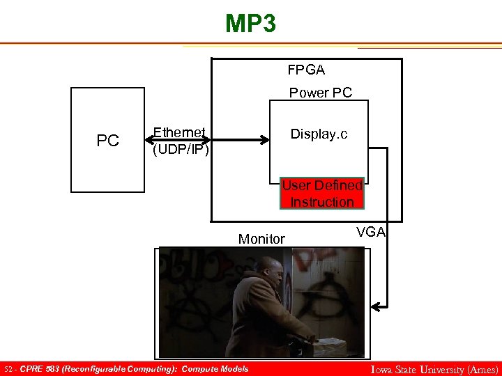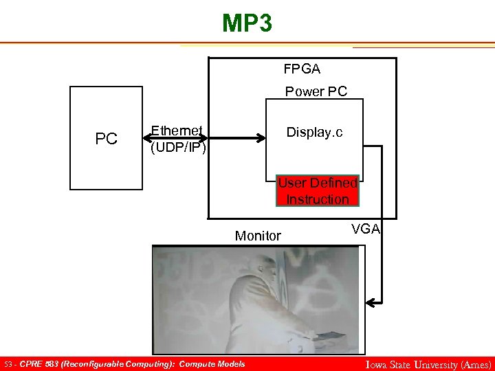 MP 3 FPGA Power PC PC Ethernet (UDP/IP) Display. c User Defined Instruction Monitor 52 - CPRE 583 (Reconfigurable Computing): Compute Models VGA Iowa State University (Ames)