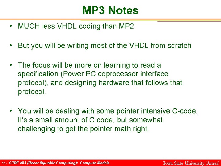 MP 3 Notes • MUCH less VHDL coding than MP 2 • But you will be writing most of the VHDL from scratch • The focus will be more on learning to read a specification (Power PC coprocessor interface protocol), and designing hardware that follows that protocol. • You will be dealing with some pointer intensive C-code. It’s a small amount of C code, but somewhat challenging to get the pointer math right. 55 - CPRE 583 (Reconfigurable Computing): Compute Models Iowa State University (Ames)