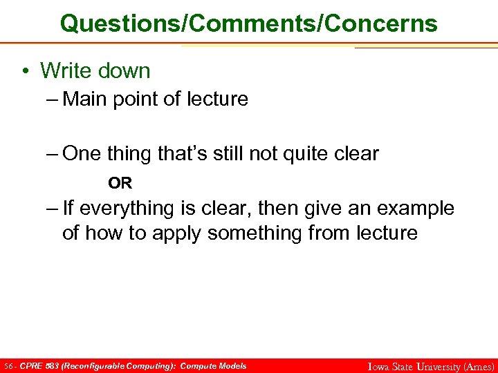 Questions/Comments/Concerns • Write down – Main point of lecture – One thing that’s still not quite clear OR – If everything is clear, then give an example of how to apply something from lecture 56 - CPRE 583 (Reconfigurable Computing): Compute Models Iowa State University (Ames)