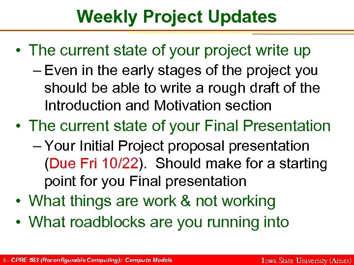 Initial Project Proposal Slides (5 -10 slides) • Project team list: Name, Responsibility (who is project leader) • Project idea • Motivation (why is this interesting, useful) • What will be the end result • High-level picture of final product • High-level Plan – Break project into mile stones • Provide initial schedule: I would initially schedule aggressively to have project complete by Thanksgiving. Issues will pop up to cause the schedule to slip. – System block diagrams – High-level algorithms (if any) – Concerns • Implementation • Conceptual • Research papers related to you project idea 5 - CPRE 583 (Reconfigurable Computing): Compute Models Iowa State University (Ames)