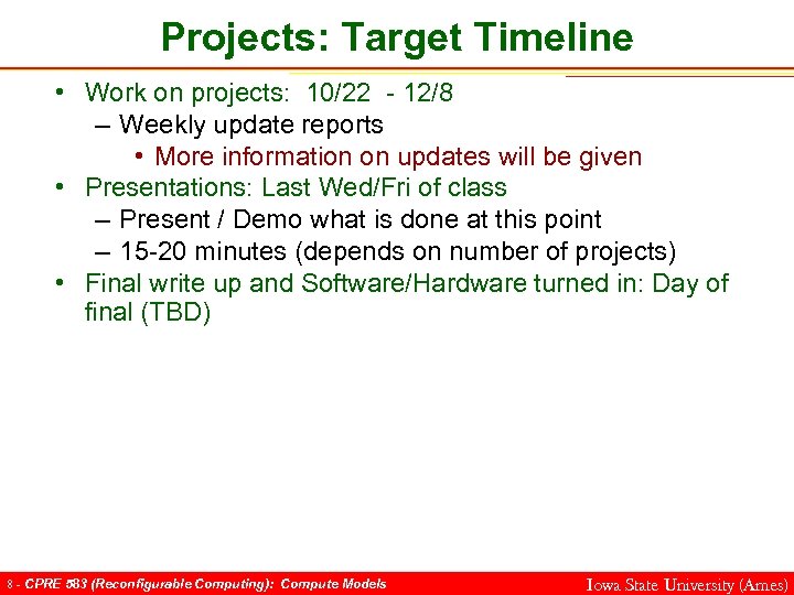 Projects: Target Timeline • Teams Formed and Idea: Mon 10/11 – Project idea in Power Point 3 -5 slides • Motivation (why is this interesting, useful) • What will be the end result • High-level picture of final product – Project team list: Name, Responsibility • High-level Plan/Proposal: Fri 10/22 – Power Point 5 -10 slides • System block diagrams • High-level algorithms (if any) • Concerns – Implementation – Conceptual • Related research papers (if any) 7 - CPRE 583 (Reconfigurable Computing): Compute Models Iowa State University (Ames)
