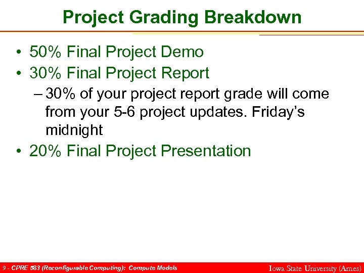 Project Grading Breakdown • 50% Final Project Demo • 30% Final Project Report – 30% of your project report grade will come from your 5 -6 project updates. Friday’s midnight • 20% Final Project Presentation 9 - CPRE 583 (Reconfigurable Computing): Compute Models Iowa State University (Ames)