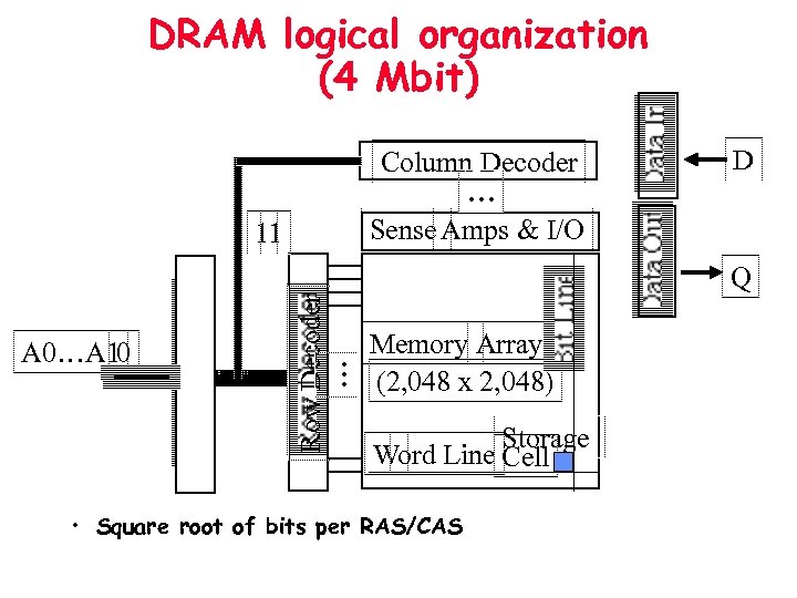DRAM logical organization (4 Mbit) Column Decoder … Sense Amps & I/O 11 D A 0…A 10 Row Decoder … Q Memory Array (2, 048 x 2, 048) Storage Word Line Cell • Square root of bits per RAS/CAS