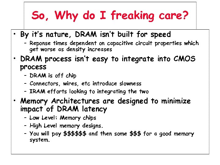 So, Why do I freaking care? • By it’s nature, DRAM isn’t built for speed – Reponse times dependent on capacitive circuit properties which get worse as density increases • DRAM process isn’t easy to integrate into CMOS process – DRAM is off chip – Connectors, wires, etc introduce slowness – IRAM efforts looking to integrating the two • Memory Architectures are designed to minimize impact of DRAM latency – Low Level: Memory chips – High Level memory designs. – You will pay $$$$$$ and then some $$$ for a good memory system.